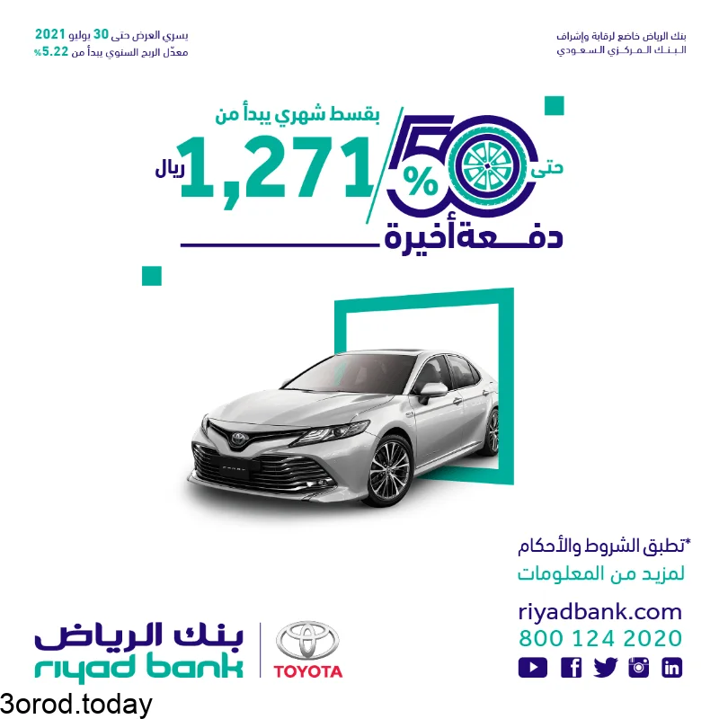 نقدم لكم اليوم عروض بنك الرياض اقوي العروض مع برنامج التمويل التأجيري للسيارات علي سيارات تويوتا 2021 والتي تقدم احدث العروض بارخص الأسعار التي تتناسب مع جميع فئات المتسوقين و بدفعة أخيرة تصل حتى 50% التي توفرها لكم عروض بنك الرياض التي تتميز بتقديم اقل الأسعار لكم تابعونا لمعرفة كل ماهو جديد عن اسعار السيارات في السعودية .