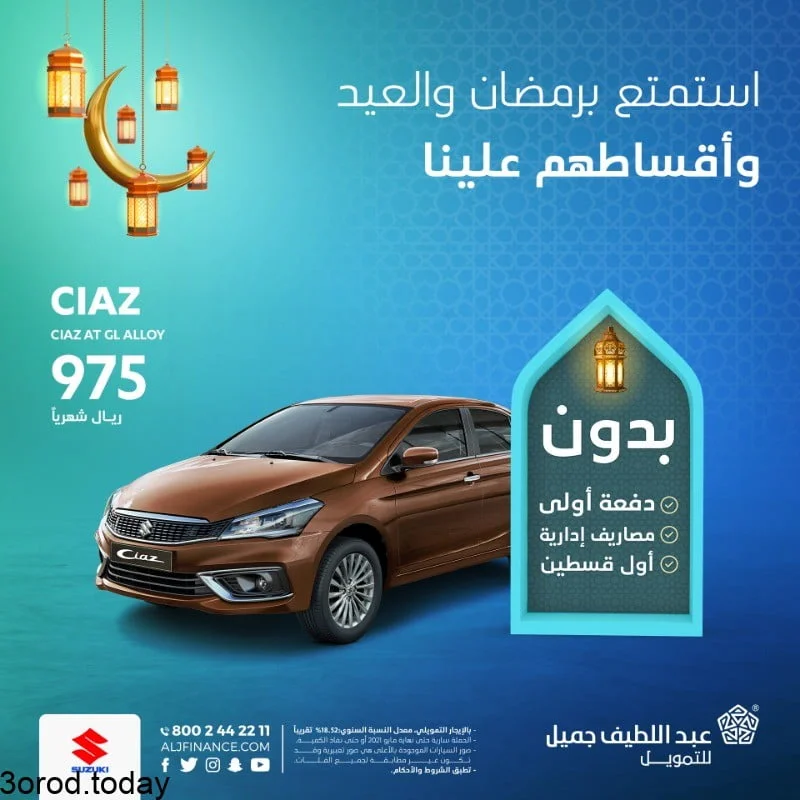 نواصل معكم اليوم عروض عبد اللطيف جميل و التي تضم مختلف من فئات سيارات سوزوكي 2021 التي نستعرضها لكم اليوم و بارخص الاسعار و بدون مصاريف ادارية و بدون دفعة أولى و تقديمها اليكم في عروض اليوم من عروض عبد اللطيف جميل تابعونا لمعرفة كل ماهو جديد في عروض السيارات علي موقعكم عروض توداي .