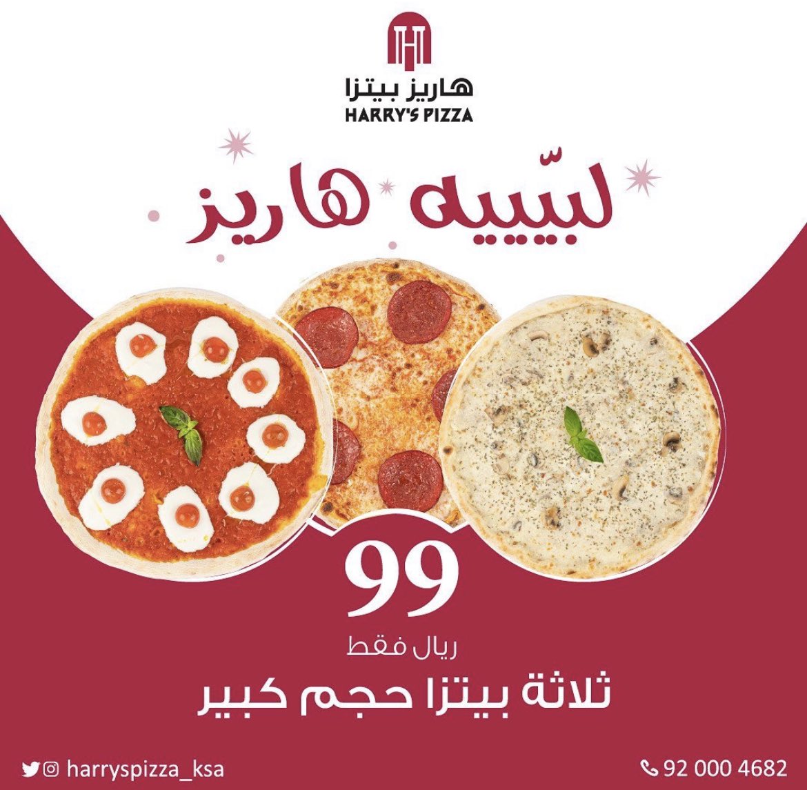 احدث عروض المطاعم 2022 نستعرضها لكم من خلال عروض مطعم هاريز بيتزا و تحتوي عروض اليوم علي ثلاثة بيتزا الحجم الكبير بـ 100 ريال سعودي فقط العرض مستمر لفترة محدودة بجميع الفروع بالرياض تابعونا علي موقعكم عروض توداي لمعرفة كل جديد عن عروض المطاعم في السعودية و انتظرونا في تغطية حصريا لـ عروض اليوم الوطني 92 .