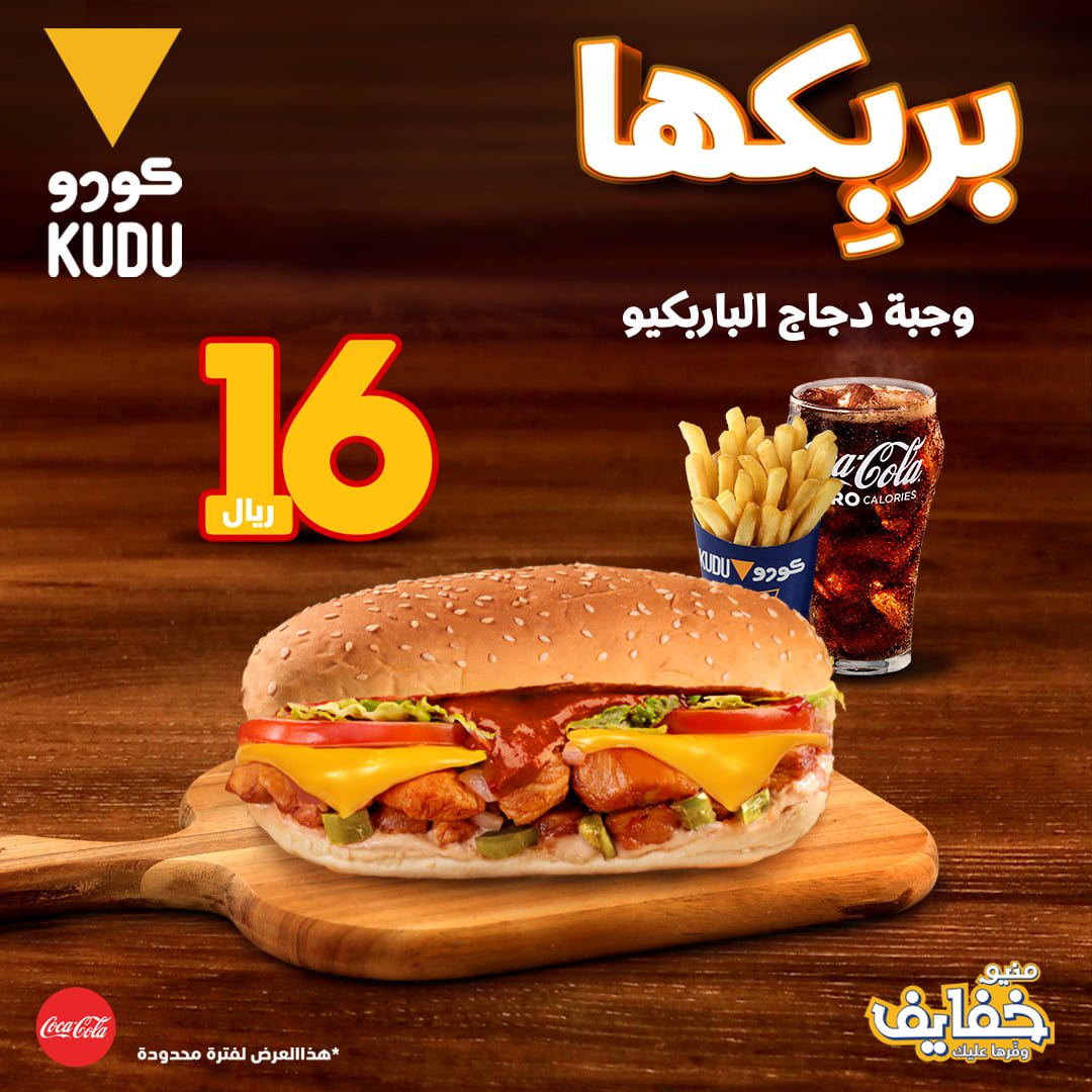 عروض مطعم كودو السعودية و الذي يعتبر من افضل عروض المطاعم في المملكة العربية السعودية و يحتوي عروض اليوم علي افضل العروض لا تفوت عليك ساندويتش دجاج باربيكيو من منيو خفايف و باقل الاسعار فقط بـ 16 ريال سعودي شرفنا في اي فرع من فروع مطعم كودو تابعونا لمعرفة كل جديد عن عروض السعودية و عروض رمضان 2022 و عروض يوم التأسيس السعودي