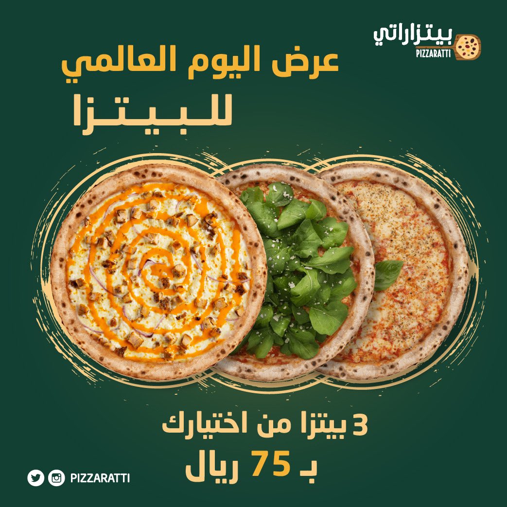 عروض مطعم بيتزاراتي و اقوي التتخفيضات بمناسبة اليوم العالمي للبيتزا و يحتوي عروض اليوم علي 3 بيتزا من اختيارك بـ 75 ريال سعودي و نقدم لحضراتكم اليوم ايضا عروض مطعم هاريز بيتزا و ايضا يقدم تخفيضات و يعتبر من افضل عروض المطاعم تابعونا ليصل لكم كل جديد عن عروض رمضان 2022 و عروض يوم التأسيس .