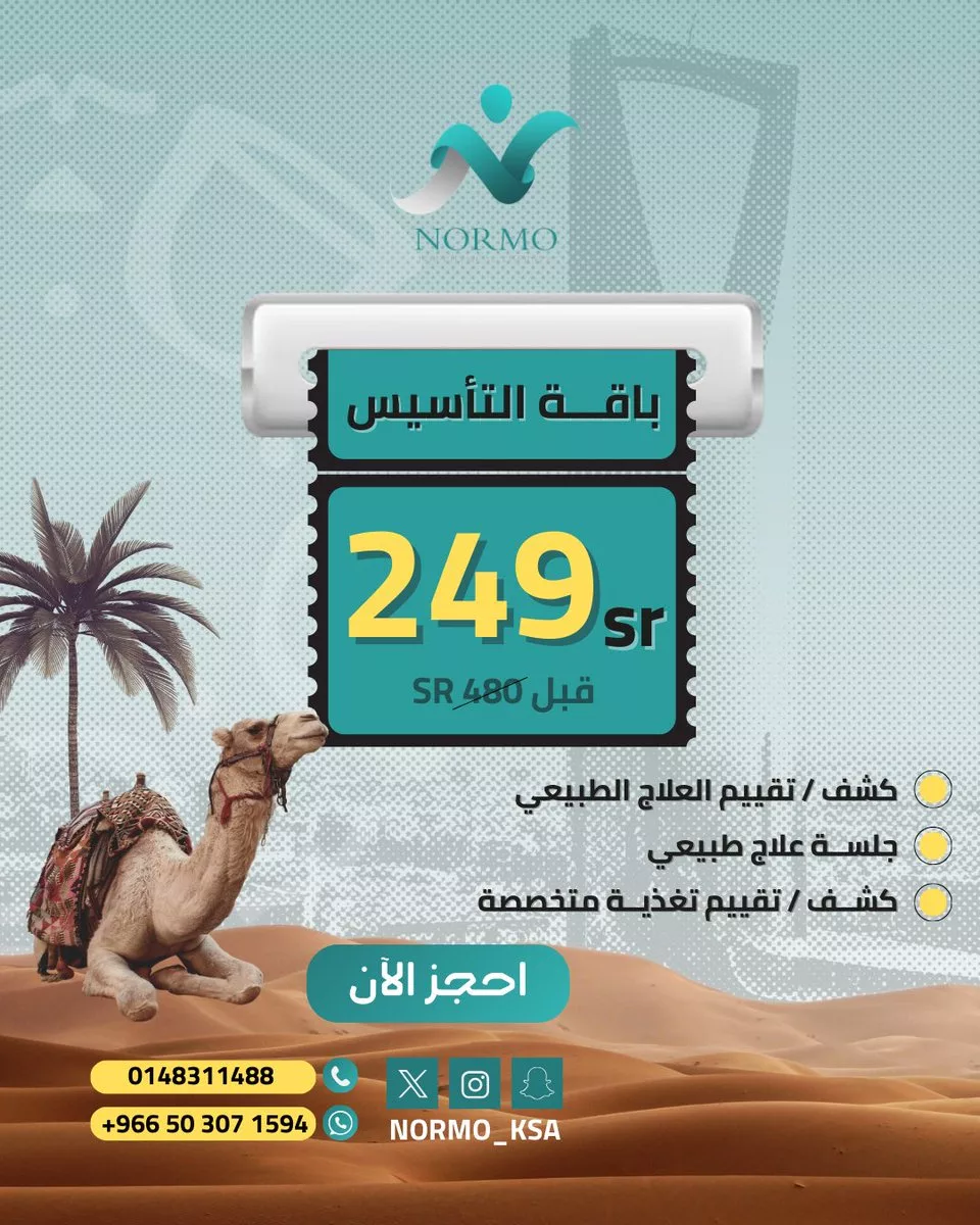 عروض مركز نورمو للعلاج الطبيعي تقدم لك فرصة مثالية للحصول على استشارة متخصصة في العلاج الطبيعي والتغذية و باقة التأسيس تمنحك كشفا طبيا شاملا لتقييم حالتك الصحية بالإضافة إلى جلسة علاج طبيعي تساعدك على تحسين الأداء الحركي وتقليل الآلام. كما تتضمن الباقة تقييمًا غذائيا متخصصا